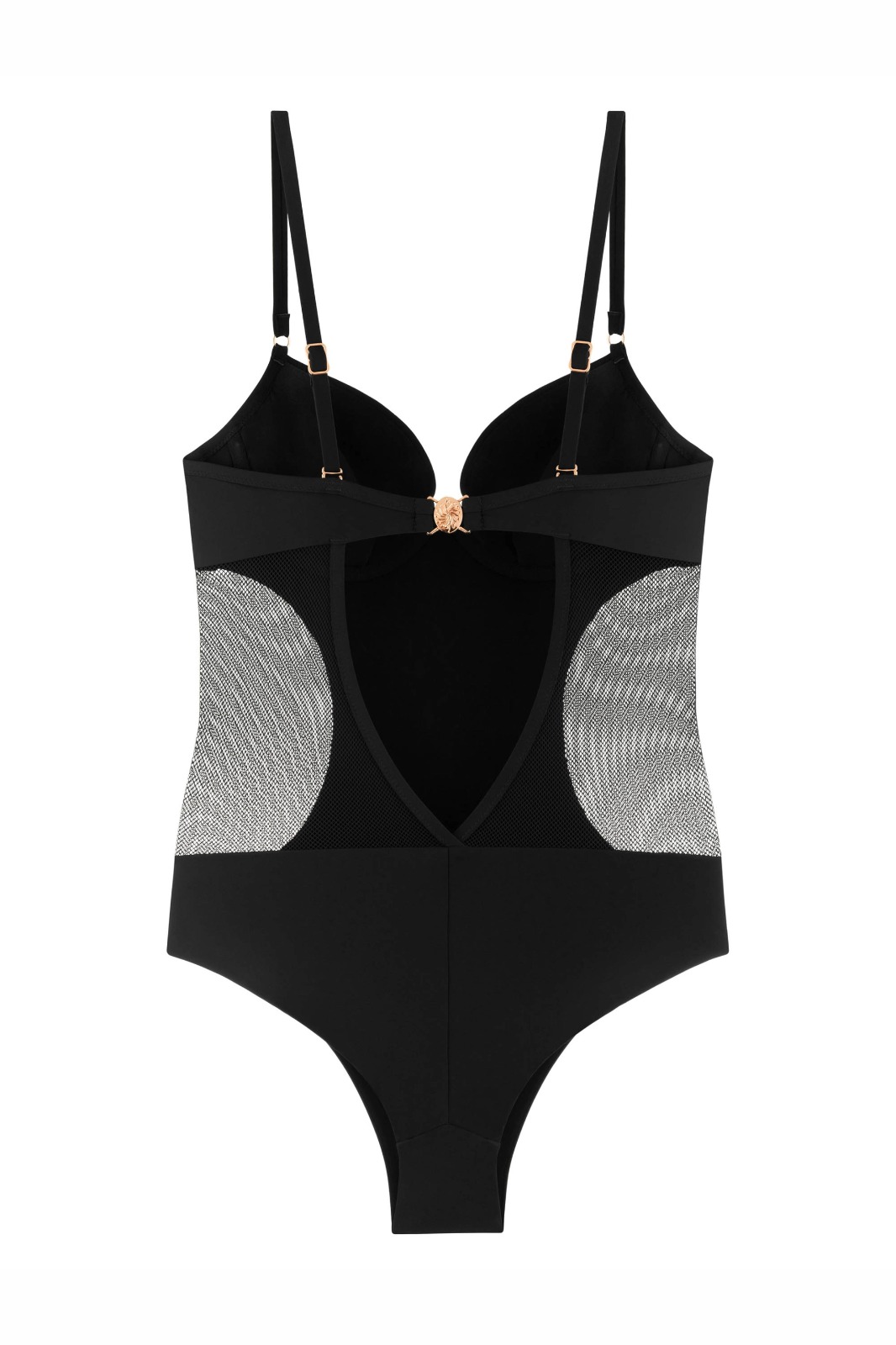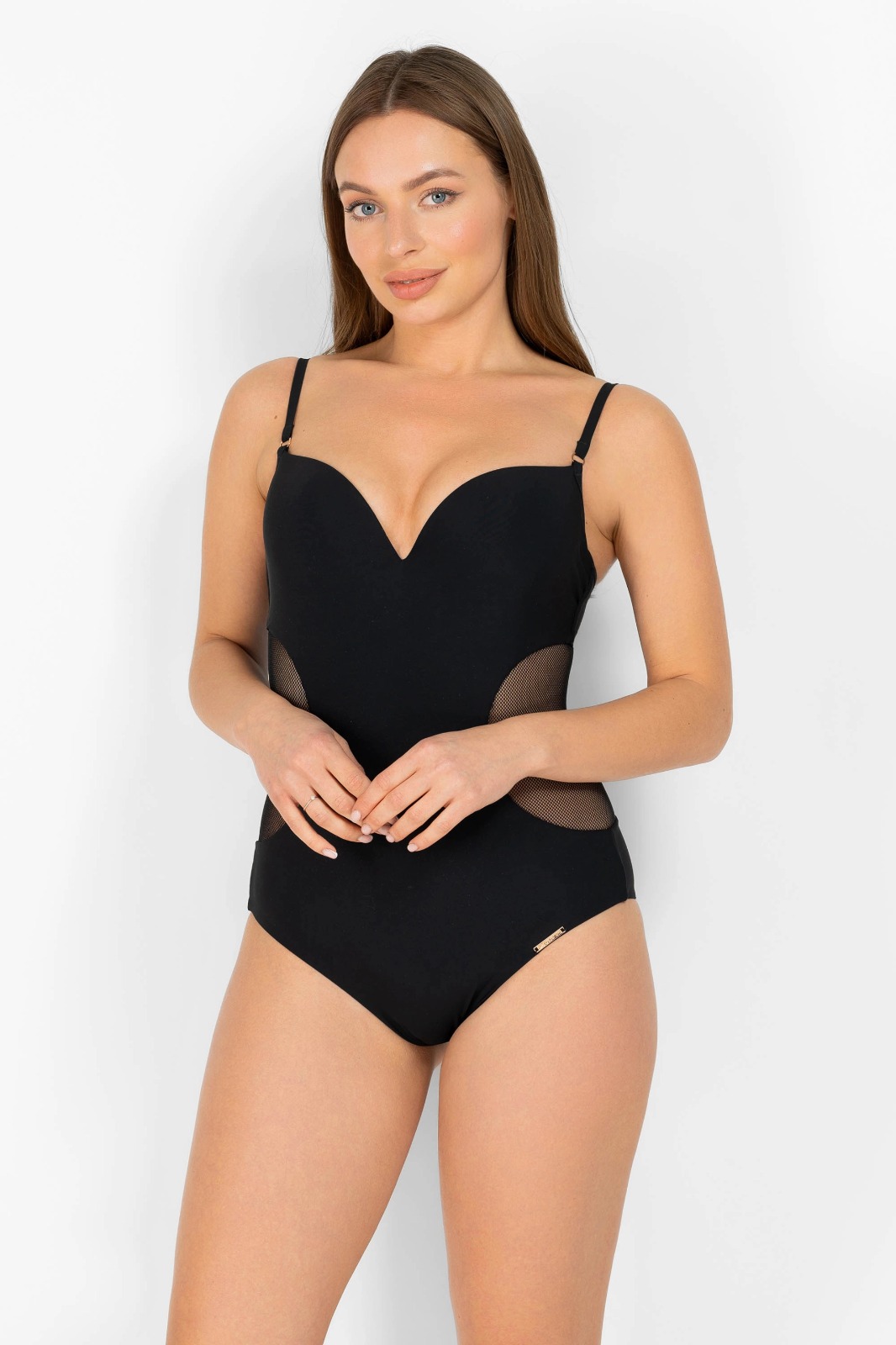 — фигурная передняя деталь с прозрачными вставками по бокам делает фигуру визуально стройной;
